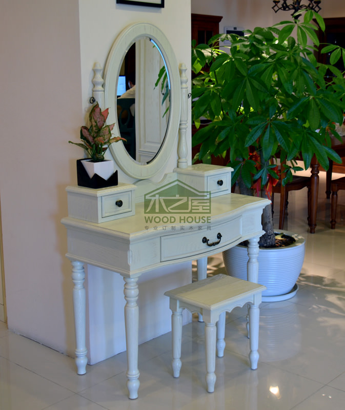 梳妆台的尺度一般可分为两类:第一类,梳妆者可将腿放入台面下,优点是人离镜面近,面部清晰,便于梳妆,平时还可将梳妆凳放入台下,不占空间。这类梳妆台高度为70-74厘米,台面为35-55厘米。第二类,梳妆者腿部都在梳妆台前。此种形式一般采用大面积镜面,使梳妆者可大部分显现镜中,并能增添室内的宽畅感。这类梳妆台高45-60厘米,宽度为40-50厘米。