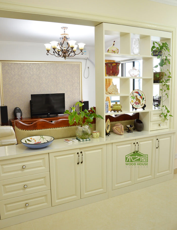 全部木制的屏风式隔断,也较为常用,有时结合鞋柜或其他家具等并列使用。或在其上置镜,又可兼有出门时整装整容的作用,它的双面都应精心制作。在木制的屏风上制作浮雕装饰或刻制名人字画等,会体现主人的儒雅风范。